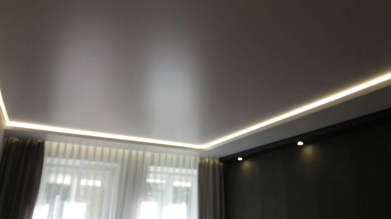 Матовый натяжной потолок с подсветкой и точечными светильниками Наша работа 39
