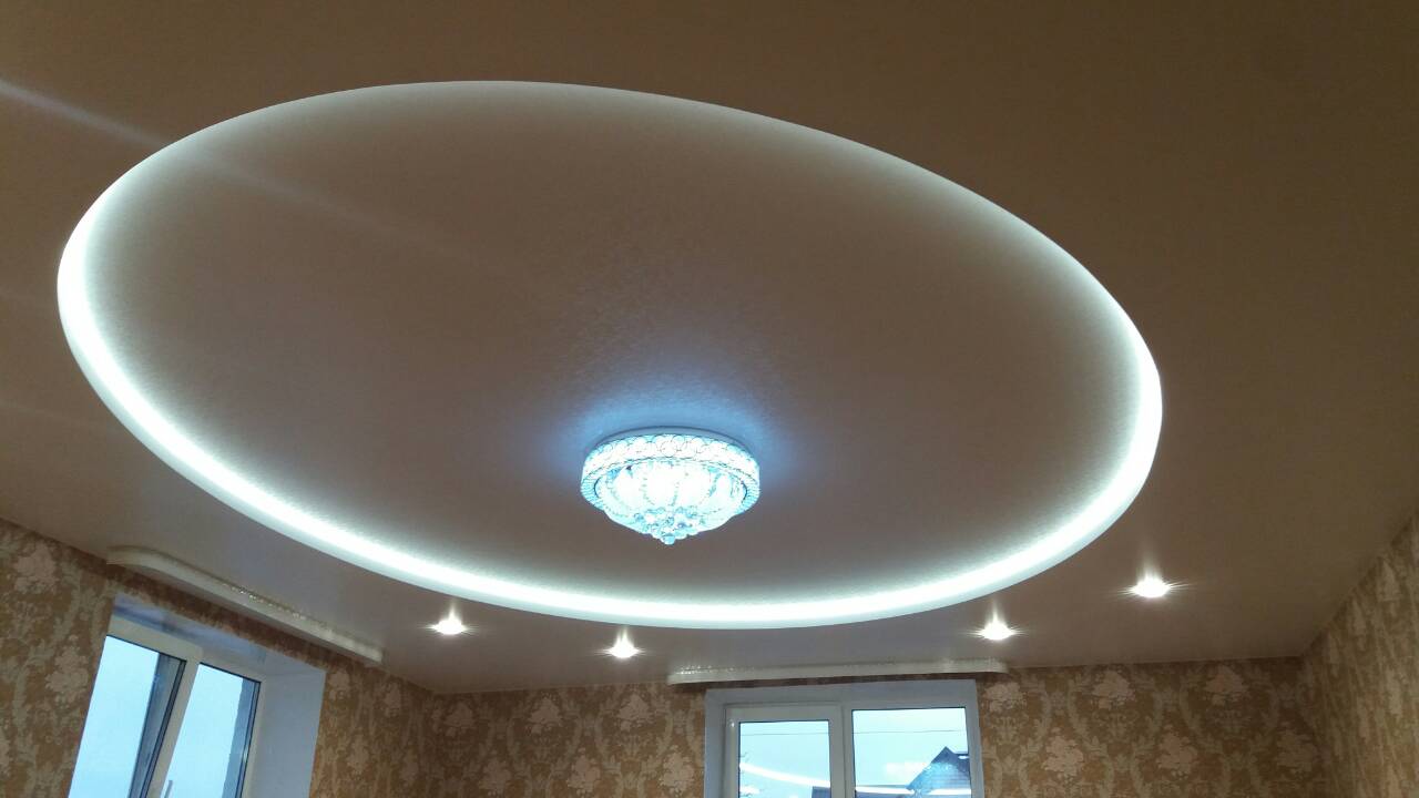 Натяжной потолок двухуровневый с точечными светильниками и люстрой в комнату Наша работа 84